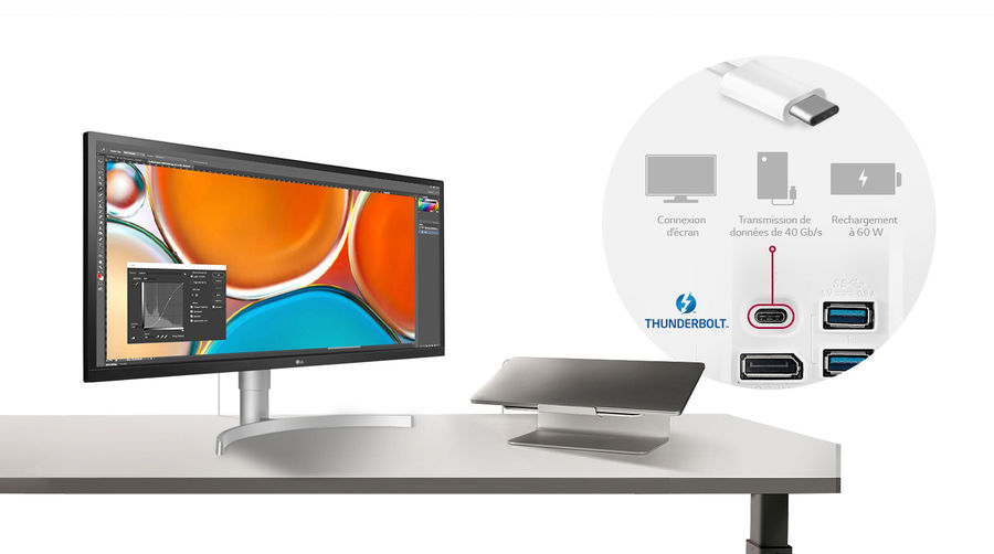 La connectique de l'écran LG 34WL850-W comprend deux ports HDMI, un DisplayPort, un port Thunderbolt (USB-C), deux ports USB ainsi qu'une prise casque.