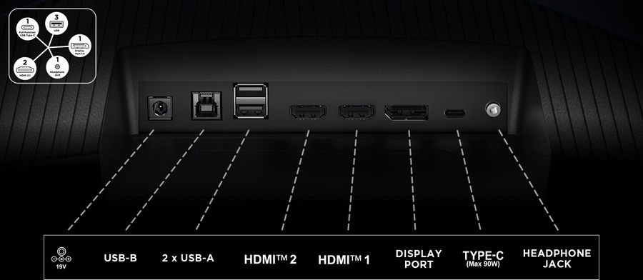 Deux ports HDMI 2.1, un DisplayPort 1.4 et un USB-C permettent de connecter de nombreuses sources au moniteur gaming TCL 27R83U. De plus, il dispose d'un hub USB et d'un KVM.