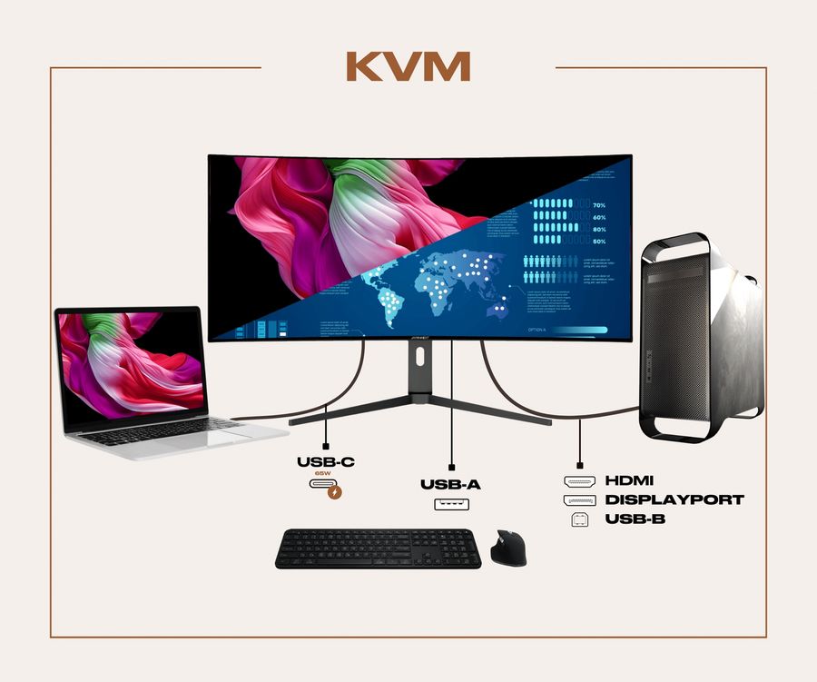 Le commutateur KVM permet de contrôler plusieurs PC à partir d'un seul ensemble clavier-souris connectés à l’écran JAPANNEXT JN-5X40. C'est une solution pratique pour les utilisateurs qui ont besoin de travailler sur plusieurs ordinateurs sans avoir à changer de périphériques à chaque fois. Il suffit de sélectionner l'un ou l'autre dans le menu du moniteur : le clavier, la souris et la webcam passent ainsi de votre ordinateur portable de travail à votre PC de jeu.