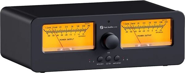Le commutateur d'enceintes Fosi LC30-Y est conçu autour d'un châssis métallique intégrant en façade deux grands VU-mètres analogiques. Ces derniers affichent en temps réel le niveau du signal audio sur chaque canal. Cette visualisation apporte une dimension esthétique forte, inspirée des équipements hi-fi vintage, tout en offrant un retour visuel immédiat sur la dynamique musicale. La luminosité du rétroéclairage est réglable sur plusieurs niveaux, et la sensibilité des aiguilles peut être ajustée pour s’adapter à différents niveaux de signal. L’appareil peut ainsi être utilisé uniquement comme VU-mètre, indépendamment de sa fonction de commutation.