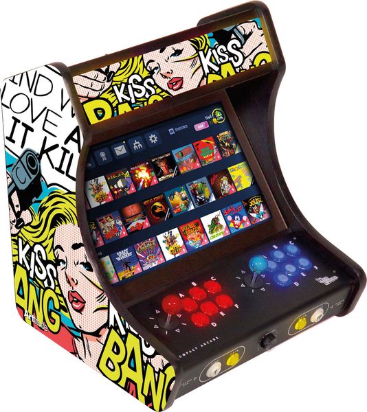 Très influencé par les œuvres sixties de Roy Lichtenstein (Crying girl, notamment), le design de la borne d'arcade Neo Legend Compact Arcade Family - Kiss Kiss Bang Bang by Butcher Billy est superbe. À noter aussi un clin d’œil à Tarantino.