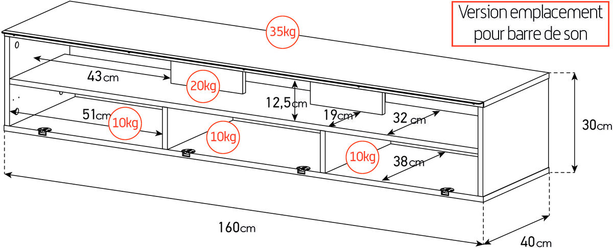 D'autre part, le second agencement est spécialement pensé pour accueillir une barre de son de 20 kg maximum sur l'étage du haut. Dans ce cas, 160 cm de largeur pour 19 cm de profondeur et 12,5 cm de hauteur permettent d'y déposer votre barre de son et ainsi profiter d'une reproduction sonore puissante et détaillée.