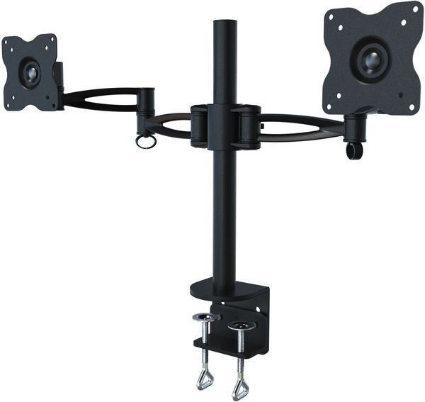 Le support d'écran Erard Nextia D-2 permet de fixer solidement à un bureau, une table ou un meuble deux écrans mesurant entre 38 et 68 cm de diagonale et pesant jusqu'à 8 kg chacun. Robuste et polyvalent, il s'adapte à votre espace grâce à ses deux bras à double pivot extensibles et ses plateformes de fixation orientables et inclinables.