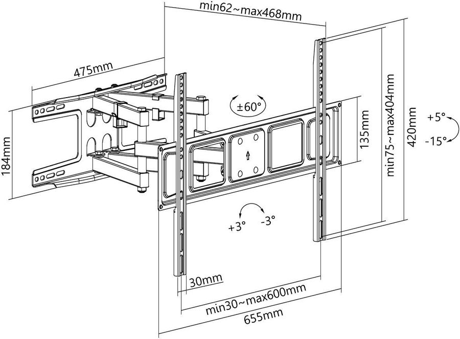 Le support mural pour TV NorStone Full Motion 120 dispose de perforations compatibles avec la norme VESA de 75 x 75 jusqu'à 600 x 400 pour accueillir la majorité des écrans de 37 à 80 pouces. Bien que le téléspectateur puisse orienter sa TV jusqu'à 46 cm du mur et sur 60°, sa structure est telle qu'il est possible de placer le téléviseur à seulement 6 cm du mur. De quoi profiter ainsi d'un aménagement plus discret ! Par ailleurs, un système de gestion des câbles est présent à l'arrière du support. Les câbles sont ainsi correctement dirigés vers le mur et peuvent ensuite être inclus dans un cache-câbles.