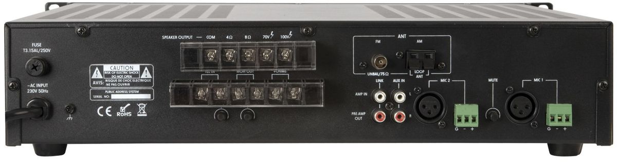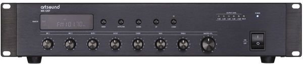 L'ampli Artsound MX-120T est capable de délivrer jusqu'à 120 watts de puissance. Cette puissance peut être délivrée à des enceintes d'une impédance de 4 ohms, 8 ohms ou à des enceintes installées sur des lignes 70 V ou 100 V. D'une grande polyvalence, l'ampli 100 V Artsound MX-120T intègre deux entrées micro et deux entrées ligne, permettant notamment d'y relier un lecteur CD ou un lecteur réseau, par exemple. En plus de ces entrées, l'ampli Artsound MX-120T est équipé d'un tuner compatible avec les bandes AM et FM. Jusqu'à 100 présélections peuvent être enregistrées pour rapidement accéder à toutes vos stations favorites. Pratique, l'ampli mono Artsound MX-120T fait également office de mélangeur en permettant de mixer simultanément ces sources, chacune à un niveau paramétrable par l'utilisateur. Par ailleurs, ces différentes entrées sont associées à un système de préamplification individuel pour appliquer du gain aux signaux entrants faibles.
