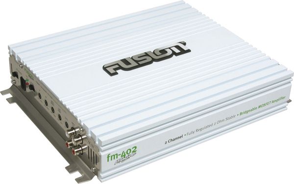 Conçu pour alimenter une paire d'enceintes stéréo, l'amplificateur de puissance Fusion FM-402 peut également fonctionner en mono avec le pontage de ses deux canaux d'amplification, auquel cas sa puissance passe à 160 voire 200 watts selon la tension de l'alimentation qui lui est appliquée. Cet ampli de puissance embarqué intègre plusieurs technologies propriétaires développées par Fusion comme la technologie d'amplification FRAT (amplification régulée), le système de refroidissement FIST et la technologie de transfert thermique FUTRANZ (voir les notes techniques). Par ailleurs, compte tenu des conditions d'utilisation particulières en audio marine, les circuits imprimés du Fusion FM-402 sont thermorégulés pour accroître leur longévité et maintenir des performances optimales en toutes circonstances.