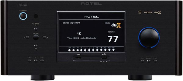 En façade, l'ampli Rotel RAP-1580 MKII intègre un grand écran de 7 pouces permettant de facilement ajuster tous les paramètres audio et vidéo de l'amplificateur sans qu'il ne soit nécessaire d'allumer le téléviseur ou le vidéoprojecteur. Dans le cadre d'une intégration dans une salle home-cinéma, c'est particulièrement appréciable pour réaliser les réglages plus facilement lorsque le rack d'équipements électroniques est séparé de l'équipement vidéo. La face avant de l'ampli home-cinéma Rotel RAP-1580 MKII accueille également une entrée HDMI compatible 4K ainsi qu'une entrée USB pour iPod, iPhone et iPad avec alimentation 5V/2,1A.