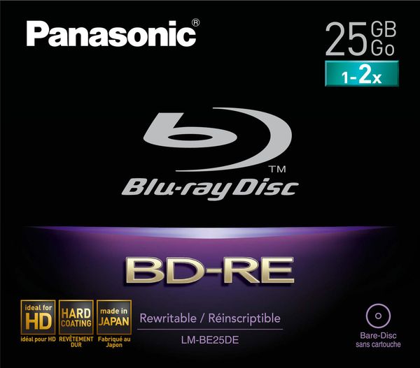 Spécialement conçus pour les enregistrements en haute définition, les disques Blu-ray enregistrables et ré-enregistrables Panasonic offrent la possibilité d'enregistrer jusqu'à 3 heures (25 Go) de programmes numériques en résolution Full HD (1920 x 1080 pixels) à la vitesse d'écriture jusqu'à x2 pour les réinscriptibles. Grâce à l'adoption de nouveaux matériaux inorganiques, et grâce aussi à l'application des technologies Black Box exclusives de Panasonic, ces disques Blu-ray affichent une durée de vie de plus de 50 ans pour l'archivage des contenus vidéo.