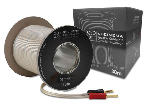 Kit câbles enceintes home-cinéma comprenant 30 mètres de câble X-Tube Cinema, 10 fiches bananes (5 rouges et 5 noires) et 10 étiquettes pour identifier les canaux.