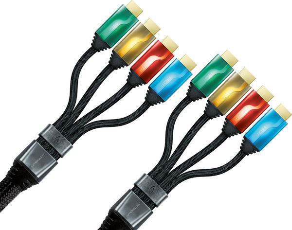 Le câble HDMI Afterglow Quadruple est un modèle certifié HDMI 1.4 et Ethernet. Sa particularité est de disposer de 4 connecteurs HDMI à chaque extrêmité ainsi que des LED de couleur différentes pour chaque paire de connecteurs. Les LED s'allument dès que le câble est branché d'un côté ou de l'autre. Tous les flux audio et vidéo, 2D comme 3D, sont supportés jusqu'au mode 1080p. Le câble HDMI Afterglow Quadruple est doté d'une gaine tressée haute résistance.