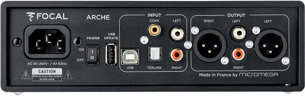 L'ampli casque Focal Arche dispose de trois entrées numériques (USB type B, optique et coaxiale) et d'une entrée analogique asymétrique (RCA stéréo). Il est donc possible d'y relier un ordinateur ainsi qu'un lecteur CD/SACD et un lecteur réseau audio, en plus d'une source analogique. Il peut s'agir par exemple d'une platine vinyle avec pré-ampli phono intégré, ou d'une platine vinyle classique avec un pré-ampli phono RIAA séparé.