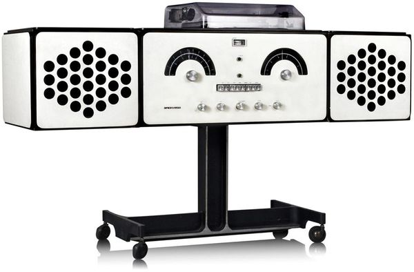 La chaîne Hi-Fi Brionvega RR226 est livrée avec son support monté sur roulettes. Une chaîne d'exception, véritable ovni dans un marché parfois trop stéréotypé, au son Hi-Fi enivrant.