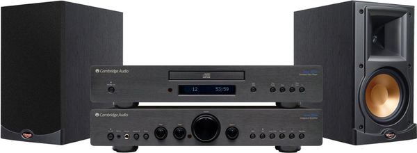 Cette chaîne Hi-Fi est composée des amplificateur et lecteur CD Cambridge Azur 350A et 350C, ainsi que de la paire d'enceintes de bibliothèque Klipsch RB-51.