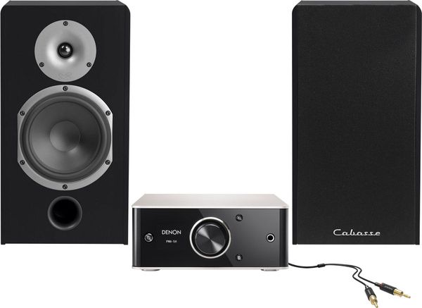 L'amplificateur-DAC Denon PMA-50 est ici associé à l'enceinte compacte Cabasse Antigua MT32. Modèle 2 voies bass-reflex, cette enceinte compacte est équipée d'un haut-parleur de grave-médium de 17 cm et d'un tweeter à dôme haut de gamme. Le premier dispose d'une longue bobine ventilée, afin de maintenir les performances musicales du transducteur à fort volume. Le tweeter dispose pour sa part du même type de membrane que le transducteur coaxial qui équipe les modèles phares de la marque, comme la Sphère par exemple. Cette membrane se distingue par une excellente résistance mécanique et une très bonne stabilité de ses performances dans le temps.
