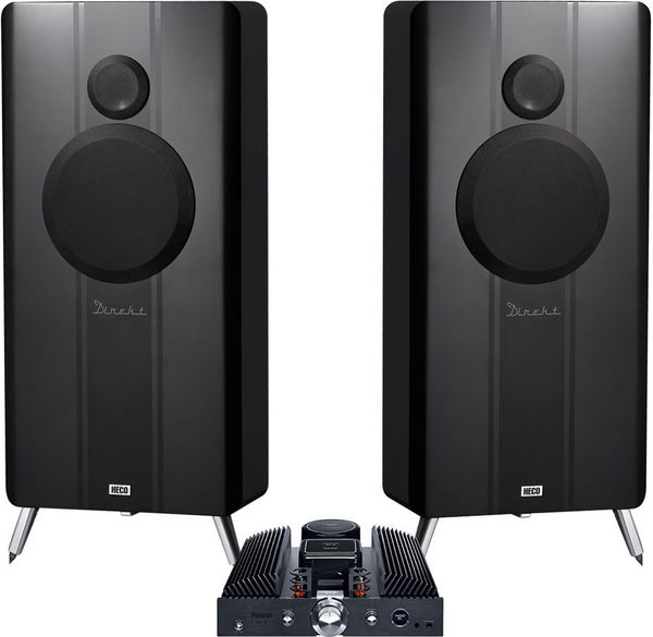 La chaîne Magnat RV3 / Heco Direkt comprend l'ampli stéréo hybride Magnat RV3 et la paire d'enceintes colonne Heco Direkt.