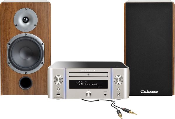 L'amplificateur réseau Marantz M-CR611 est ici associé à l'enceinte compacte Cabasse Antigua MT32. Modèle 2 voies bass-reflex, cette enceinte compacte est équipée d'un haut-parleur de grave-médium de 17 cm et d'un tweeter à dôme haut de gamme. Le premier dispose d'une longue bobine ventilée, afin de maintenir les performances musicales du transducteur à fort volume. Le tweeter dispose pour sa part du même type de membrane que le transducteur coaxial qui équipe les modèles phares de la marque, comme la Sphère par exemple. Cette membrane se distingue par une excellente résistance mécanique et une très bonne stabilité de ses performances dans le temps.