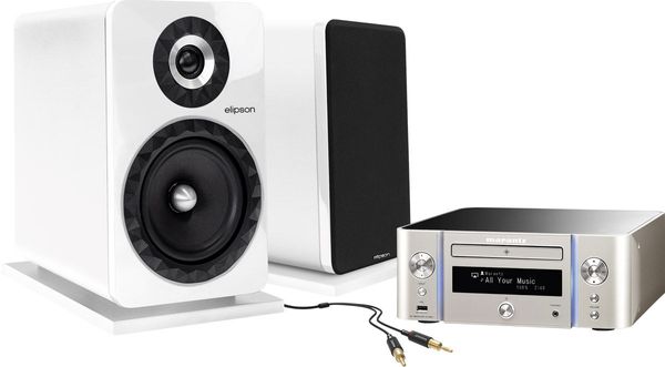 L'ampli Marantz M-CR611 est ici associé à une paire d'enceintes Elipson Prestige Facet 8B. Cette enceinte compacte embarque un haut-parleur médium-grave de 17 cm de diamètre doté d'une ogive centrale limitant les turbulences, causes de distorsions. Le tweeter est un modèle à dôme souple de 25 mm de diamètre. Ces deux haut-parleurs sont réalisés par un fabricant tiers selon un cahier des charges très exigeant. Exclusivité de la gamme d'enceintes Elipson Prestige Facet, une couronne en gomme synthétique taillée sur mesure entoure chaque haut-parleur afin de limiter l'effet de baffle et les diffractions. La courbe de réponse est ainsi moins perturbée, plus linéaire, pour une écoute plus douce.