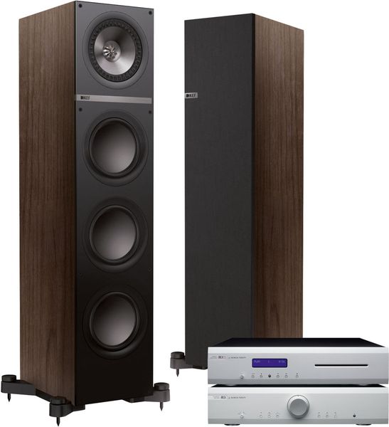 Chaîne Hi-Fi Musical Fidelity M3/ KEF Q700 comprenant l'amplificateur Intégré Musical Fidelity M3i Silver, le lecteur CD Musical Fidelity M3CD Silver et la paire d'enceintes KEF Q700 Noyer