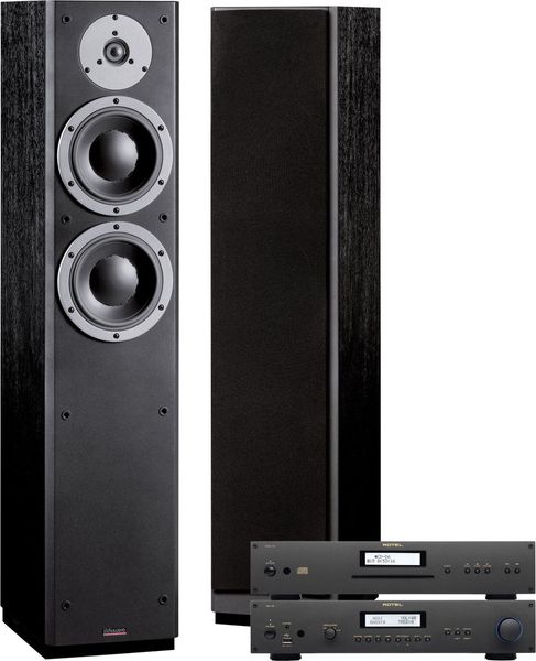 Cette composition marie des électroniques anglaises de cœur de gamme au rapport qualité /prix défiant toute concurrence, avec des enceintes équipées de haut-parleurs sur-motorisés. Un ensemble très dynamique, optimisé tant pour l'écoute des musiques analogiques que numériques. L'amplificateur intégré Rotel RA-12 est l'évolution du fameux RA-10, couvert de louanges par la presse internationale (amplificateur stéréo de l'année 2012 pour What HiFi ?). Écoute pleine de punch, registre médium fouillé, puissance de 2x60 watts adaptée aux enceintes Dynaudio DM 3/7 : cet amplificateur est très performant. En comparaison du RA-10, le Rotel RA-12 gagne un DAC Wolfson WM8740, soit l'un des convertisseur numérique-analogique les plus réputés du marché. Ainsi, le Rotel RA-12 est-il équipé d'une prise USB en façade pour lire les fichers MP3, AAC ou WAV d'une clé ou d'un disque dur USB. Des entrées numériques au format coaxial et optique complètent sa connectique et en font un intégré stéréo totalement "branché", d'autant qu'un récepteur Bluetooth est fourni pour recevoir les musiques "streamées" depuis un ordinateur, un smartphone ou une tablette. Le lecteur CD Rotel RCD-12 est doté du même convertisseur numérique/analogique Wolfson 24 bits /192 kHz, servi par un excellent étage de sortie analogique.