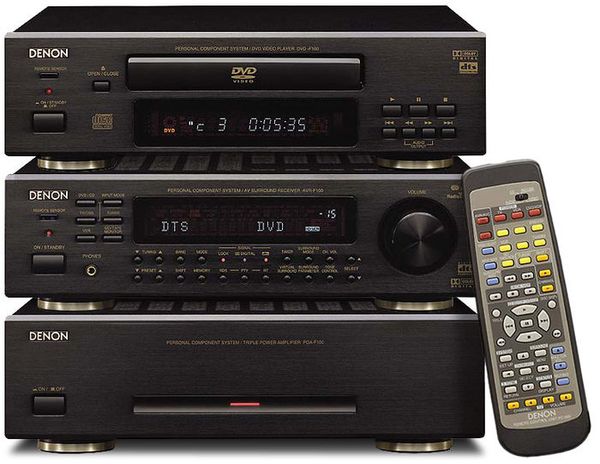 Système home-cinéma Denon DF-100AV comprenant le système d'amplification AVR-F100A/V + POA-F1003 et le lecteur DVD DVD-F100
