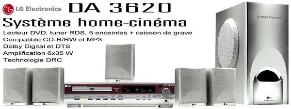 Evolution du tout-intégré DA-3520, le DA-3620 LG bénéficie d'une nouvelle esthétique splendide et d'une amplification améliorée avec 5x35W par canal + 35W pour le caisson de grave. Facilité d'intégration, facilité d'installation et simplicité d'utilisation sont les premiers atouts de cet ensemble home-cinéma tout-en-un. Lecteur DVD multizone, tuner RDS, 5 enceintes et un caisson de grave équipent ce système DA-3620, conçu pour être relié directement au téléviseur via la prise péritel/S-Vidéo. A moins de 300 euros, vous bénéficiez de tout le confort du DVD avec ce superbe ensemble LG. Un produit très apprécié pour sa grande compatibilité et ses effets sonores de spatialisation.