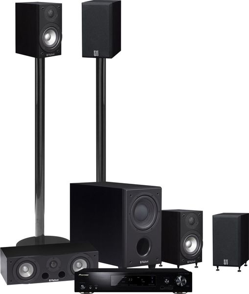 La chaîne home-cinéma Pioneer 510 / Highland 31HC comprend l'amplificateur Pioneer VSX-S510 et le pack d'enceintes Highland Aingel 31 HC Dord constitué de 4 enceintes Highland Audio Aingel 3201 (avec une une paire de pieds Highland HiStand), d'une enceinte centrale Highland Audio Aingel 320c et du caisson Highland Dord 165..