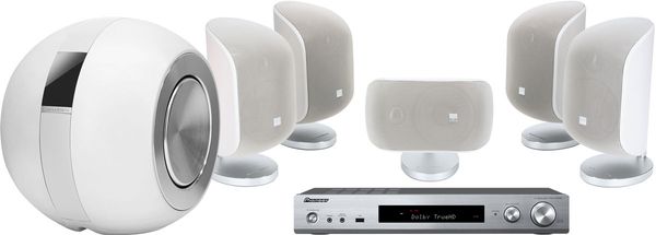 Les enceintes satellite B&W M1 MKII sont ici associées à l'époustouflant caisson de basses B&W PV1D. La particularité de celui-ci repose sur deux facteurs : une charge sphérique close, à la manière d'Elipson et deux haut-parleurs de grave de 20 cm de diamètre à membranes en kevlar et aluminium, fonctionnant de concert. Ajoutez à cela une amplification en classe D de 400 watts, qui pilote d'une main de fer la moindre excursion des membranes et vous obtenez un registre grave somptueux, détaillé à souhait en HiFi et profond et dantesque en home-cinéma. Les mesures sont éloquentes, avec une réponse qui plonge jusqu'à 7,5 Hz (- 3 dB) ! Les réglages possibles sont pléthoriques et notamment accessibles depuis l'afficheur LCD tactile du caisson, avec évidemment la fréquence de coupure, mais également la pente du filtre passe-bas et la phase électrique du signal. La sensibilité des entrées peut être ajustée de plus ou moins 6 dB afin d'être certain que le B&W PV1D s'auto-allume correctement. Pour ne rien gâcher, le B&W PV1D s'avère compact, avec un diamètre d'environ 35 cm.