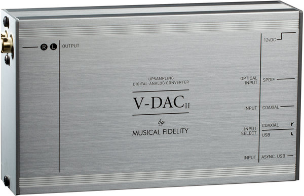 Le DAC USB Musical Fidelity V-DAC 2 est équipé d'une connectique numérique complète, avec un port USB asynchrone et deux entrées S/PDIF coaxiale RCA et optique Toslink. Ce DAC peut ainsi être connecté à un ordinateur ou à toute autre source équipée d'une sortie audio numérique, afin d'en extraire les flux audio et les convertir au format analogique.