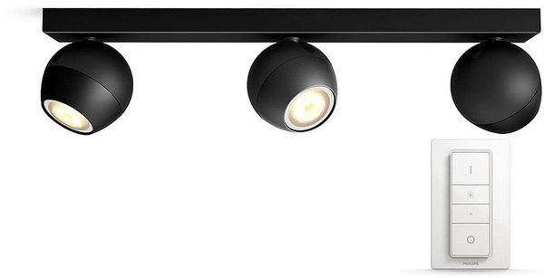 Le Philips Hue Buckram 3 Spots est une rampe de 3 spots connectés avec deux ampoules LED GU10 intégrées de 5,5 watts chacune, ce qui équivaut à un éclairage classique d'environ 50 watts au total. Conçu pour être installé aussi bien dans une cuisine que dans un séjour ou une chambre à coucher, il permet d'éclairer une zone bien précise avec ses têtes inclinables et orientables. Ce luminaire connecté Philips Hue diffuse une lumière blanche (blanc froid) dont l'intensité peut être réglée via une application dédiée (nécessite le module Philips Hue Bridge vendu séparément). L'intensité lumineuse peut également être modulée via l'interrupteur variateur connecté Philips Hue White Dimmer inclus dans la boîte. Celui-ci peut être clipsé sur sa base fixée au mur, ou utilisé comme une télécommande pour suivre l'utilisateur n'importe où dans la pièce.