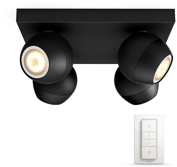 Le Philips Hue Buckram 4 Spots est une rampe de 4 spots connectés avec deux ampoules LED GU10 intégrées de 5,5 watts chacune, ce qui équivaut à un éclairage classique d'environ 50 watts au total. Conçu pour être installé aussi bien dans une cuisine que dans un séjour ou une chambre à coucher, il permet d'éclairer une zone bien précise avec ses têtes inclinables et orientables. Ce luminaire connecté Philips Hue diffuse une lumière blanche (blanc froid) dont l'intensité peut être réglée via une application dédiée (nécessite le module Philips Hue Bridge vendu séparément). L'intensité lumineuse peut également être modulée via l'interrupteur variateur connecté Philips Hue White Dimmer inclus dans la boîte. Celui-ci peut être clipsé sur sa base fixée au mur, ou utilisé comme une télécommande pour suivre l'utilisateur n'importe où dans la pièce.