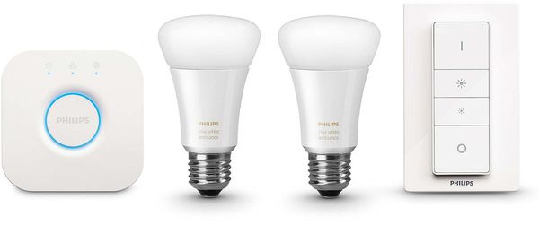 Le pack Philips Hue White Ambiance Set (E27 - 9,5 Watts) comprend un pont Philips Hue Bridge, un interrupteur connecté Philips Hue White Dimmer et deux ampoules connectées Philips Hue White Ambiance E27.