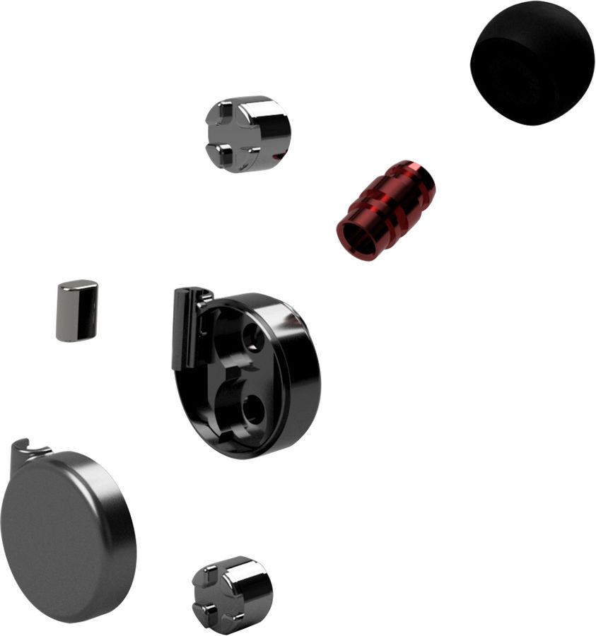 Les filtres des écouteurs intra-auriculaires Trinity Phantom Sabre sont stockés dans des cylindres pour offrir un rangement sécurisé.