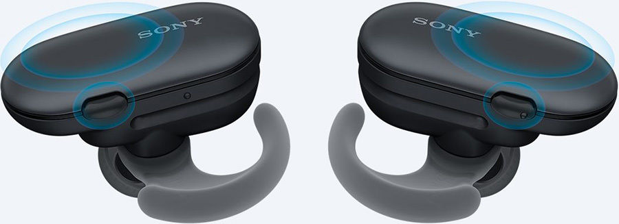 L'interface de commande des écouteurs True Wireless Sony WF-SP900 est simple et fonctionnelle, grâce à deux boutons de contrôle (un par oreillette). Une double pression sur le bouton côté gauche permet de baisser le volume et une double pression du côté droit permet de l'augmenter. En appuyant une fois sur le bouton de gauche, on active et on désactive le mode bruit ambiant, et il suffit d'appuyer deux fois pour activer ou désactiver les paramètres Quick Sound. Le bouton droit permet de démarrer la lecture, de mettre en pause, de passer à la chanson suivante, de revenir en arrière, de prendre des appels ou encore de lancer l'assistant vocal (avec une pression longue).