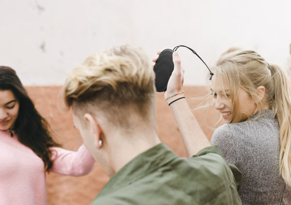 Le contrôle de l'enceinte Bluetooth Bang & Olufsen P2 s'opère facilement par différents gestes. Le changement de piste s'effectue en secouant horizontalement l'enceinte vers la gauche ou la droite (suivant/précédent).