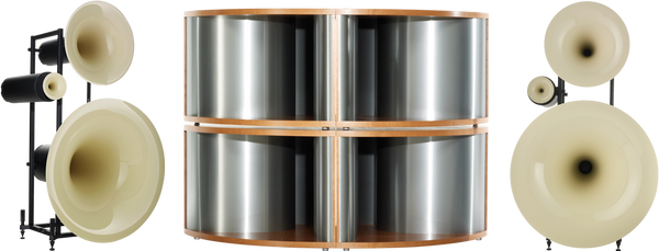 Pour obtenir des basses et des infra-basses capable d'étendre le spectre dynamique des enceintes Trio et d'accroître simultanément leur impact émotionnel, le caisson de basses Avantgarde Acoustic Basshorn est le partenaire idéal. Ce caisson de basses hors normes qui offre une réponse en fréquence de 18 à 250 Hz embarque deux haut-parleurs de 30 cm, placés au fond d'un pavillon expo-sphérique en MDF et aluminium. Ils sont alimentés par une amplification de 2 x 500 watts RMS. Il faut se figurer que la bouche du pavillon represente une surface qui atteint presque 1 m², ce qui lui permet de déplacer un volume d'air phénoménal et de produire une énergie réellement époustouflante.