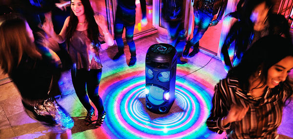 La chaîne Sony MHC-V72D s'inscrit dans la gamme de chaînes Sony destinées à animer fêtes d'anniversaire, karaokés ou soirées foot. Elle dispose pour cela d'une puissante amplification chargée d'alimenter ses 7 haut-parleurs dont un haut-parleur de grave de 30 cm de diamètre. Elle embarque également un lecteur CD/DVD, une connectivité numérique et analogique (sortie HDMI ARC, port USB audio, entrée micro et guitare), une connectivité Bluetooth, une interface de commandes gestuelle étanche eau et poussière et même de puissant effets lumineux !