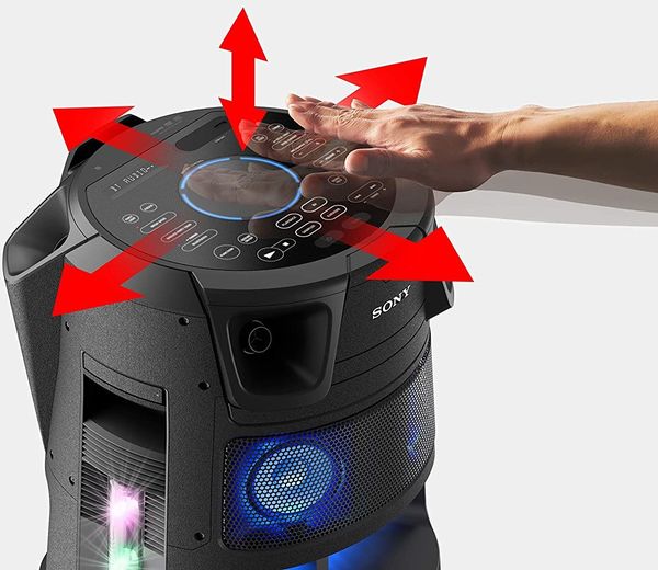 Amusante et intuitive, l'interface de contrôle gestuelle, étanche eau et poussières, de l'enceinte Sony MHC-V83D permet de gérer les effets DJ, l'échantillonneur et le karaoké. D'un geste de la main vers la gauche ou la droite, passez au morceau suivant et réglez le volume d'un mouvement vers le haut ou le bas. Personnaliser l'ambiance de la fête n'a jamais été aussi amusant. De plus, vous pouvez accompagner les morceaux avec des échantillons de bongo, de djembé, de surdo et de Taiko, le tambour japonais, simplement en appuyant sur le panneau supérieur au rythme de la musique.