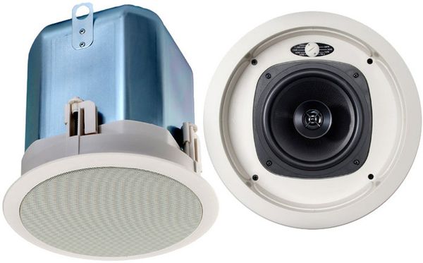 Le pack Klipsch IC-6T permet une installation facile dans le plafond. La charge arrière est assuré par un coffret. Le transformateur intégré permet de choisir le mode 16 ohms/100 V. Cette enceinte 2 voies offre un son très clair, aussi à l'aise sur la musique que sur les annonces.