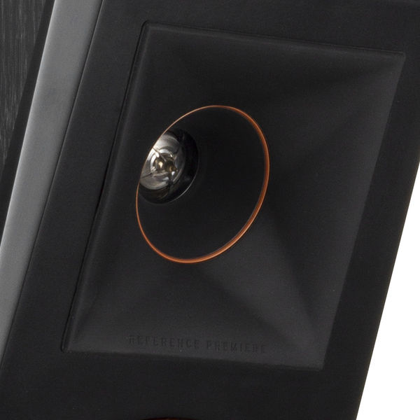 C'est également le cas du tweeter de la Klipsch RP-500SA à dôme titane et suspension LTS (Long Travel Suspension), monté sur pavillon acoustique Tractrix. Pour rappel, le pavillon permet d'exploiter le tweeter plus bas en fréquence - ce qui améliore le régime transitoire du registre médium - en améliorant son rendement de façon mécanique. Les fréquences médiums et aiguës diffusées s'atténuent également moins avec la distance, ce qui idéal pour des enceintes destinées à diffuser le son par réflexion au plafond. La nouveauté de ce millésime repose sur la cavité arrière du tweeter (la chambre de compression) qui est désormais accordée, soit ouverte. Ainsi, les ondes stationnaires sont réduites, tout autant que la génération d'ondes harmoniques indésirables. Le son diffusé est doux et précis, un caractère renforcé par le pavillon à revêtement amortissant en caoutchouc.