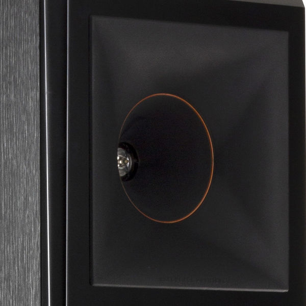 C'est également le cas du tweeter à dôme titane et suspension LTS (Long Travel Suspension), monté sur pavillon acoustique Tractrix. Pour rappel, le pavillon permet d'exploiter le tweeter plus bas en fréquence - ce qui améliore le régime transitoire du registre médium - en améliorant son rendement de façon mécanique. Les fréquences médiums et aiguës diffusées s'atténuent également moins avec la distance, ce qui permet d'utiliser les enceintes Klipsch RP-8060FA à plusieurs mètres de distance, tout en conservant clarté et dynamisme. La nouveauté repose sur la cavité arrière du tweeter (la chambre de compression) qui est désormais accordée, soit ouverte. Ainsi, les ondes stationnaires sont réduites, tout autant que la génération d'ondes harmoniques indésirables. Le son diffusé est doux et précis, un caractère renforcé par le pavillon à revêtement amortissant en silicone.