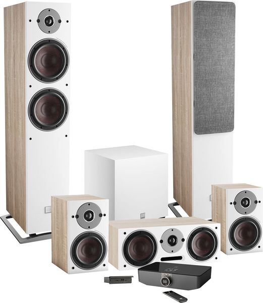 Cet ensemble home-cinéma Dali comprend une paire d'enceintes sans fil hi-fi Dali Oberon 7 C, une paire d'enceintes sans fil hi-fi Dali Oberon 1 C, une enceinte centrale sans fil Dali Oberon Vokal C, le caisson de basses Dali Sub C8-D, le transmetteur audio Dali Sound Hub et le module Multicanal HDMI 7.1/5.1. Cet ensemble Dali permet de réaliser un système home-cinéma 5.1 canaux sans le moindre câble d'enceintes avec tout téléviseur ou vidéoprojecteur.