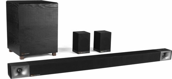 La barre de son Klipsch Bar 48 équipée d'un véritable canal central et d'un caisson de basses sans fil est ici associée aux enceintes surround sans fil Klipsch Surround 3 afin de constituer un véritable système home-cinéma 5.1 canaux sans le moindre câble d'enceinte.