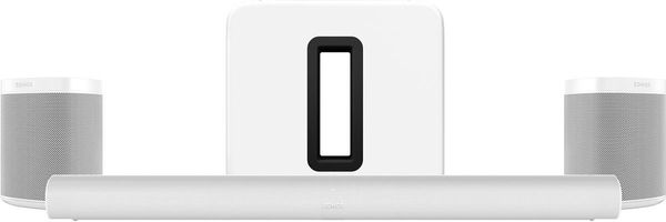 Ce système home-cinéma sans fil 5.1 comprend la barre de son Dolby Atmos Sonos Arc, la paire d'enceintes connectées Sonos One et le caisson de basses Sonos SUB (gen 3).