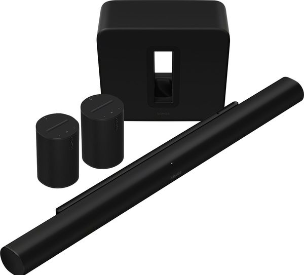 Le pack home-cinéma Sonos Arc Ultra 5.1 Era 100 comprend la barre de son Sonos Arc Ultra ainsi qu'une paire d'enceintes connectées Sonos Era 100 et le caisson de basses sans fil Sonos Sub 4.