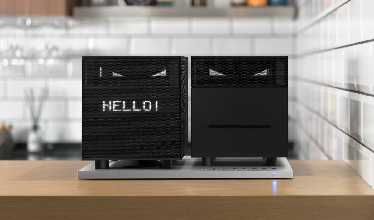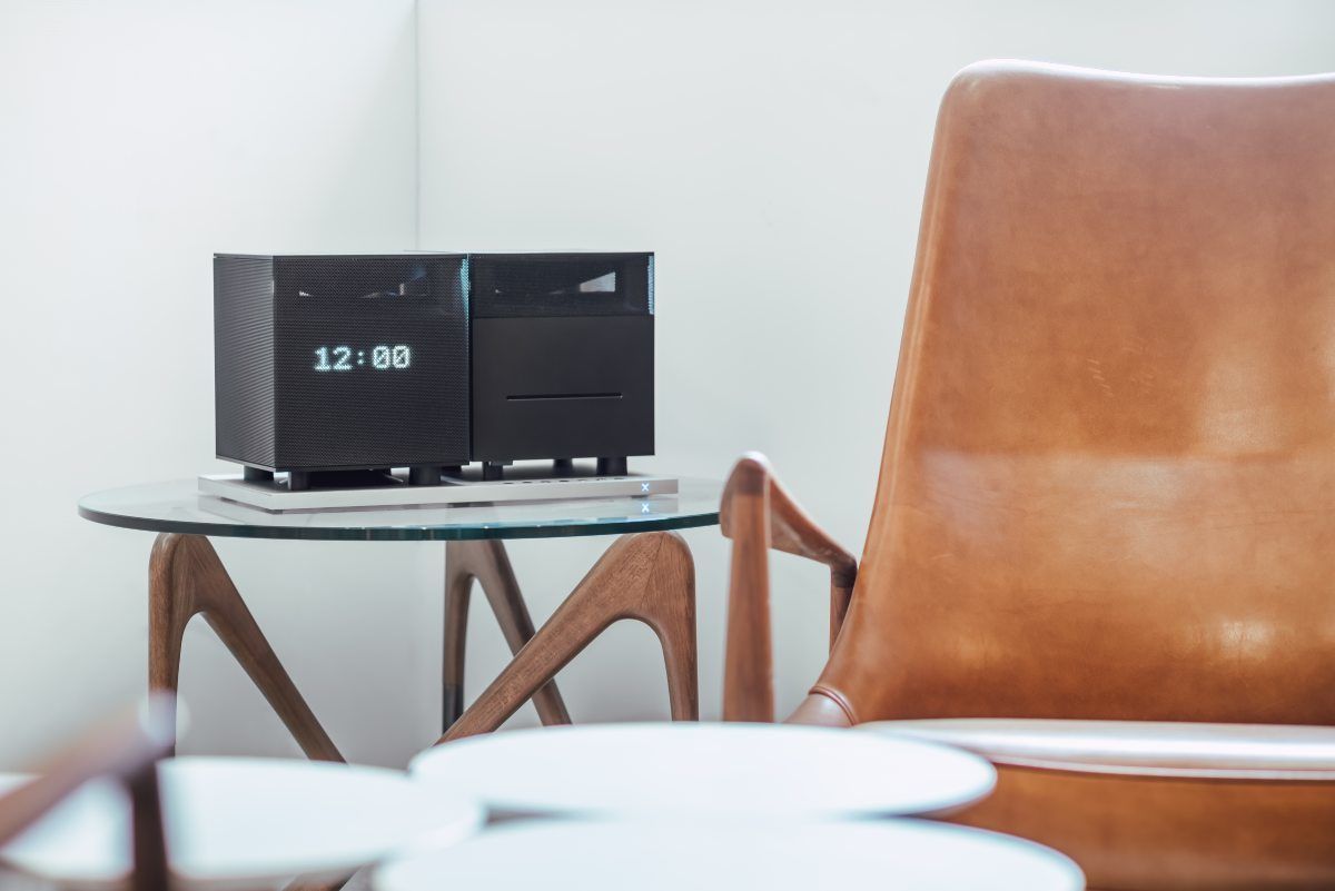 La chaîne hi-fi Aerix DUET est composée de deux enceintes fixées sur une plaque amortissante faisant également office d'interface de commande.