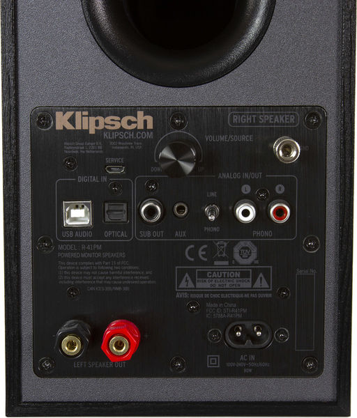 L'enceinte Klipsch R-41PM dispose d'une entrée USB-B, optique, phono et ligne.