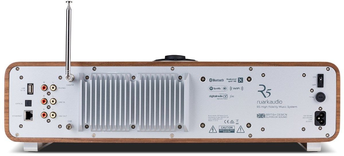 La connectique de la chaîne compacte Ruark Audio R5 est très généreuse, avec un port USB pour recharger un appareil compatible, une entrée phono pour cellules à aimant mobile (MM), une entrée ligne RCA pour connecter un lecteur CD et une entrée optique pour relier un téléviseur, par exemple. Une sortie casque est également disponible sur la face avant de l'enceinte connectée Ruark Audio R5 pour écouter vos musiques et émissions radio préférées sans déranger votre entourage.
