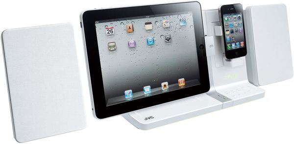 La chaîne iPod/iPhone/iPad JVC UX-VJ5 est caractérisée par ses deux docks : l'un dédié à l'iPod et à l'iPhone, l'autre à la tablette iPad. Il sera ainsi possible de connecter deux iDevices en même temps. A noter que le dock iPod/iPhone est rotatif, il permettra ainsi une disposition en mode portrait ou en mode paysage. On relèvera également une connectique très complète qui offrira de nombreuses fonctionnalités. Ainsi, un port mini-USB autorisera la connexion à un ordinateur pour la diffusion des fichiers musicaux contenus sur celui-ci. Également au programme, un port USB, une entrée auxiliaire et une sortie casque. Toujours au chapitre de la connectique, une sortie pour caisson de basses est prévue, ce qui permettra d'étendre considérablement le registre grave. A ce sujet, la diffusion du signal sonore est confiée à deux enceintes indépendantes qui pourront ainsi être positionnées pour une qualité sonore optimale. De son côté, une sortie vidéo permettra de connecter l'UX-VJ5 à un téléviseur afin d'afficher les vidéos contenues sur l'iDevice. Enfin, le lecteur CD dispose d'une fonction d'enregistrement sur un un périphérique de stockage USB.