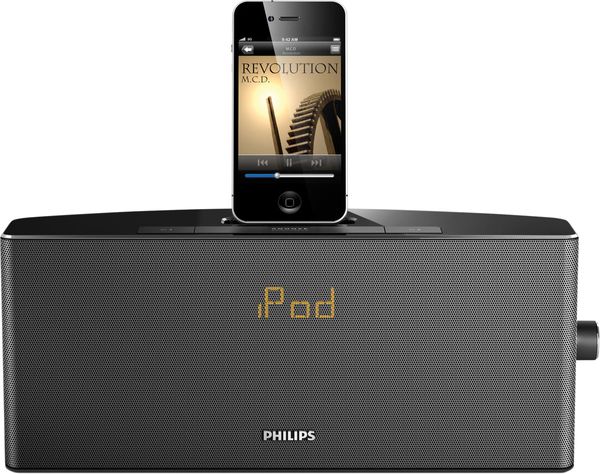 L'enceinte et radio-réveil pour iPhone et iPod Philips AJ7034D a été conçue pour prendre place dans une chambre, idéalement sur un table de nuit, mais aussi dans une plus grande pièce de vie. Son amplificateur numérique de 10 watts et ses deux haut-parleurs large-bande chargés en bass-reflex s'avèrent en effet performants. Cette enceinte iPhone Philips AJ7034D dispose d'un afficheur LED intégré avec fonction horloge, dont la luminosité varie en fonction des besoins. Si vous disposez d'un iPhone, l'heure sera automatiquement synchronisée. La Philips AJ7034D intègre également un tuner FM avec recherche automatique des stations et mémorisation de 20 fréquences. Son connecteur Apple permet à la Philips AJ7034D de recharger un iPhone ou un iPod. Enfin, l'application iOS gratuite HomeStudio permet d'exploiter au mieux la Philips AJ7034D, en écoutant par exemple ses radios préférées ou en accédant à la météo. Enfin, une entrée auxiliaire permet de connecter n'importe quelle source analogique (baladeur MP3, tablette, etc.). Compacte et élégante, l'enceinte Philips AJ7034D se révèle également pratique et très fonctionnelle.