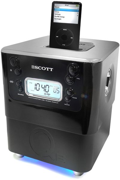 Compatible avec les iPods munis d'un dock connector, la radio Scott ADX-90R intègre deux haut-parleurs stéréo plus un haut-parleur pour les basses pour diffuser vos titres préférés avec une belle dynamique. Vous pouvez le commuter facilement en mode radio FM pour écouter vos stations favorites (mémoire 30 présélections). L'afficheur LCD rétro-éclairé bleu indique l'heure au format 12 ou 24 h ainsi que la fréquence de la station reçue. L'ADX-90R charge également la batterie de votre iPod à chaque fois que vous le posez dessus. L'entrée auxiliaire permet de connecter n'importe quel lecteur MP3 avec le câble mini-jack fourni. Pratique, la télécommande ultra plate donne accès aux principale fonctions de l'ADX-90R. Enfin, les différents modes d'égalisation pré-programmés vous permettront d'adapter le rendu sonore au type de musique écouté. Simple, pratique et original, l'ADX-90R deviendra très vite le complément indispensable de votre iPod au quotidien.